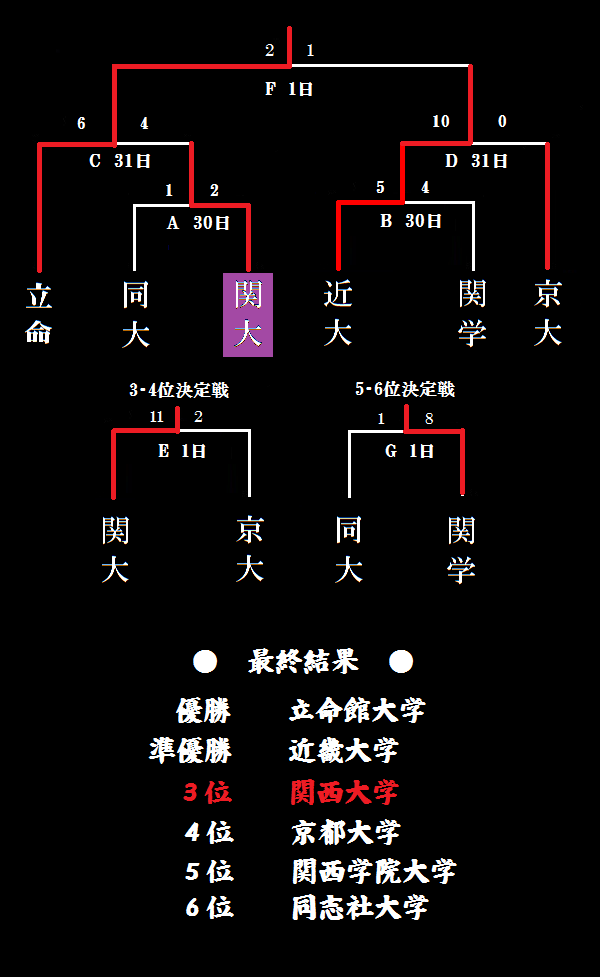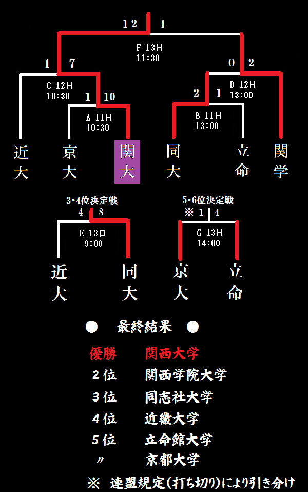 G 5位・6位決定戦 京 大 1-4 立 命 (連盟規定により引き分け) |