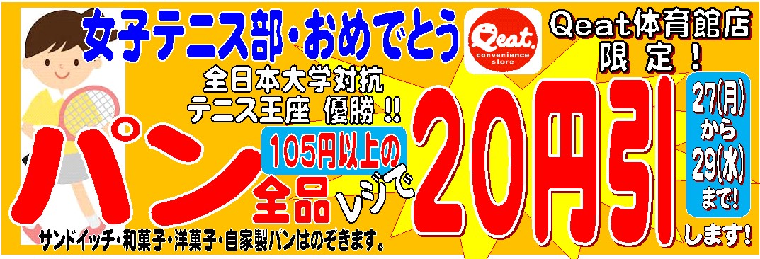 体育会<女子テニス部>優勝おめでとう! Qeatコンビニ体育館店では 『パン20円引』セールでお祝いします!