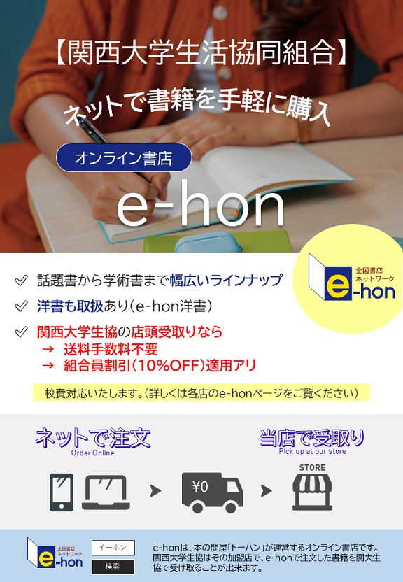 関西大学生協組合員(もしくはそのご家族)が以下の条件を満たすと、e-honで注文した商品にも組合員割引(10%OFF)が適用されます。