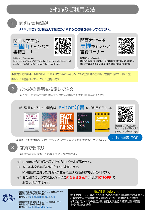 関西大学生協はその加盟店で、e-honで注文した書籍を関大生協で受け取ることが出来ます。