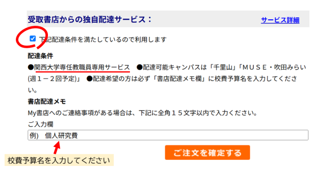 注文を頂く際、「書店からの独自配達サービス」内の「書店配達メモ欄」(下記画像参照)に必ず校費予算名を入力して注文確定してください。
